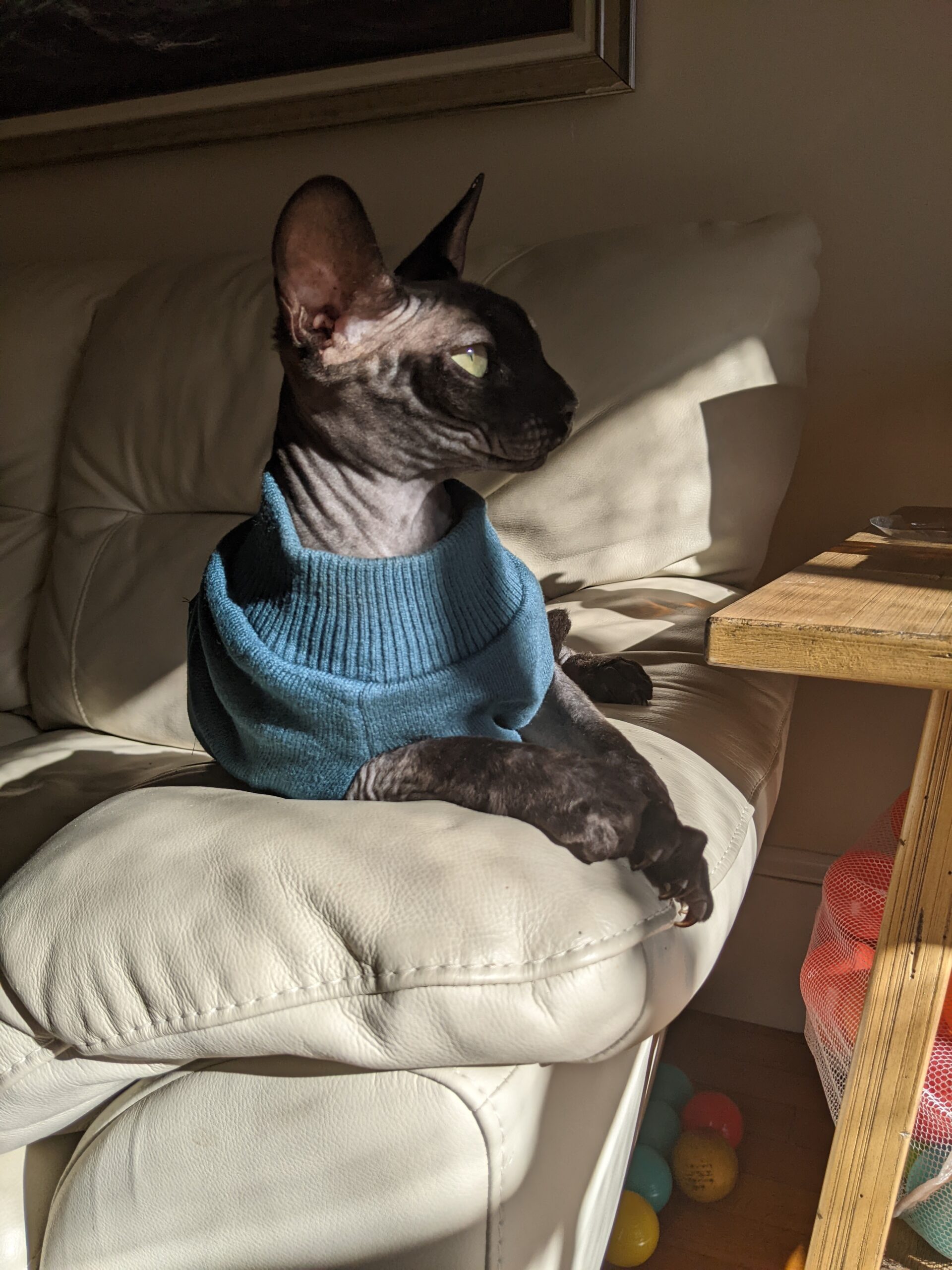 Aisteach is one of the major highlights of coming inside after a long day working in the field. He is also the best companion during a workday filled with meetings and computer screens. Born in April of ’21, he loves cuddles and sweaters (frequently made by Amber) — especially in winter — since he is a Sphynx cat and therefore has little to no hair. He is also very adventurous and loves to go on walks, car rides, and to the beach.